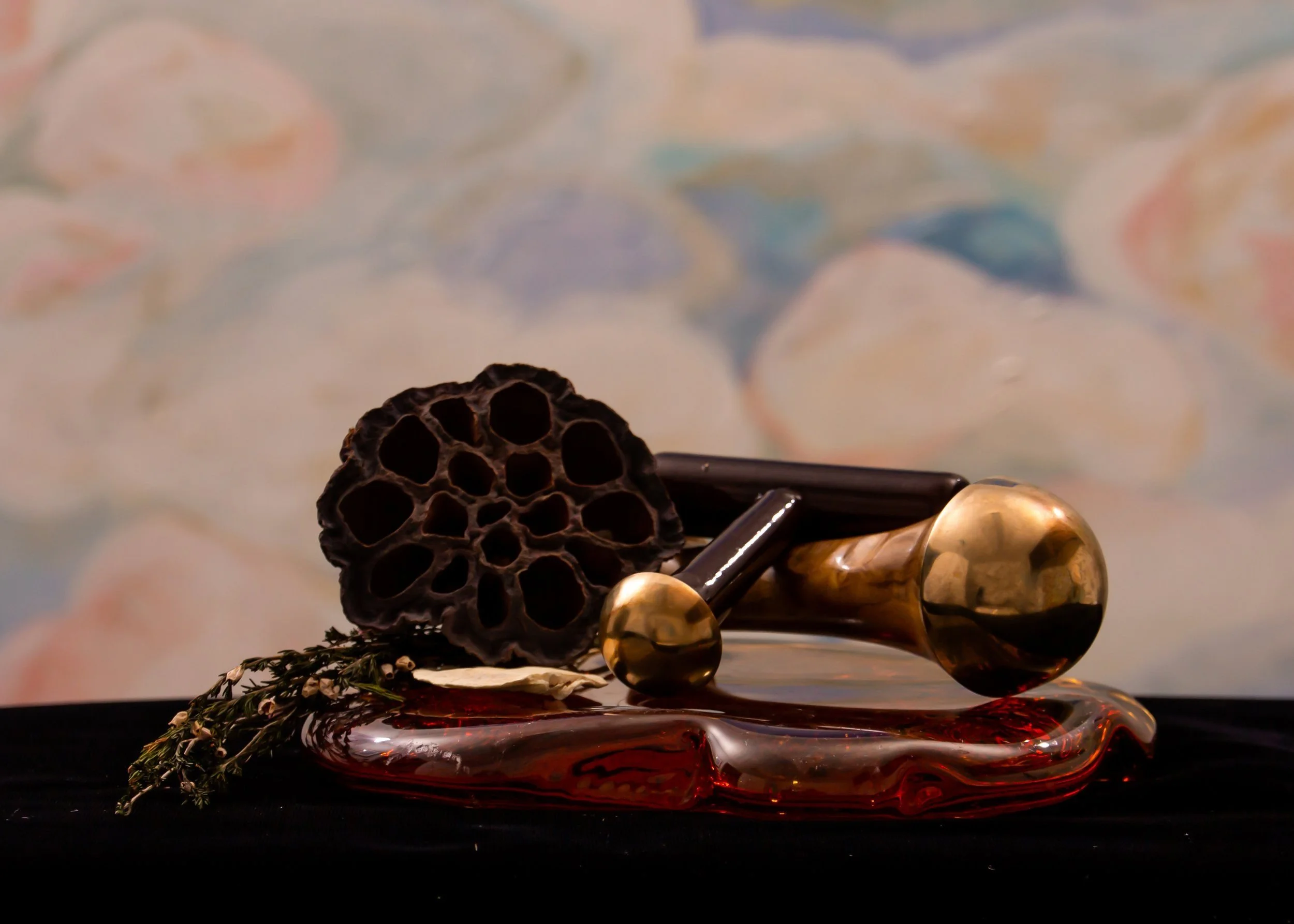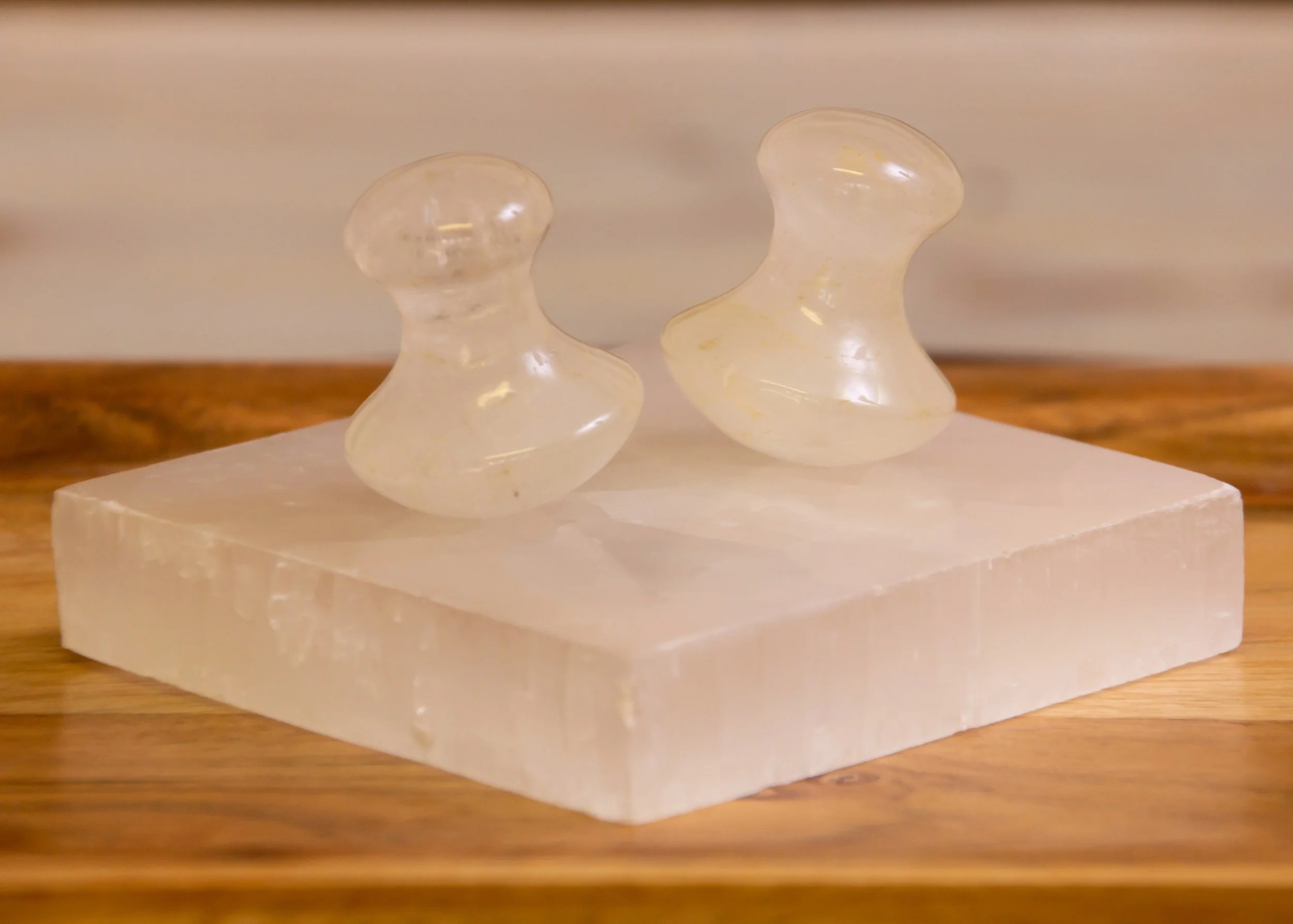 Holistic tools such as: crystal and gem stone gua sha tools, spoons, mushrooms, rollers, and kansa wands